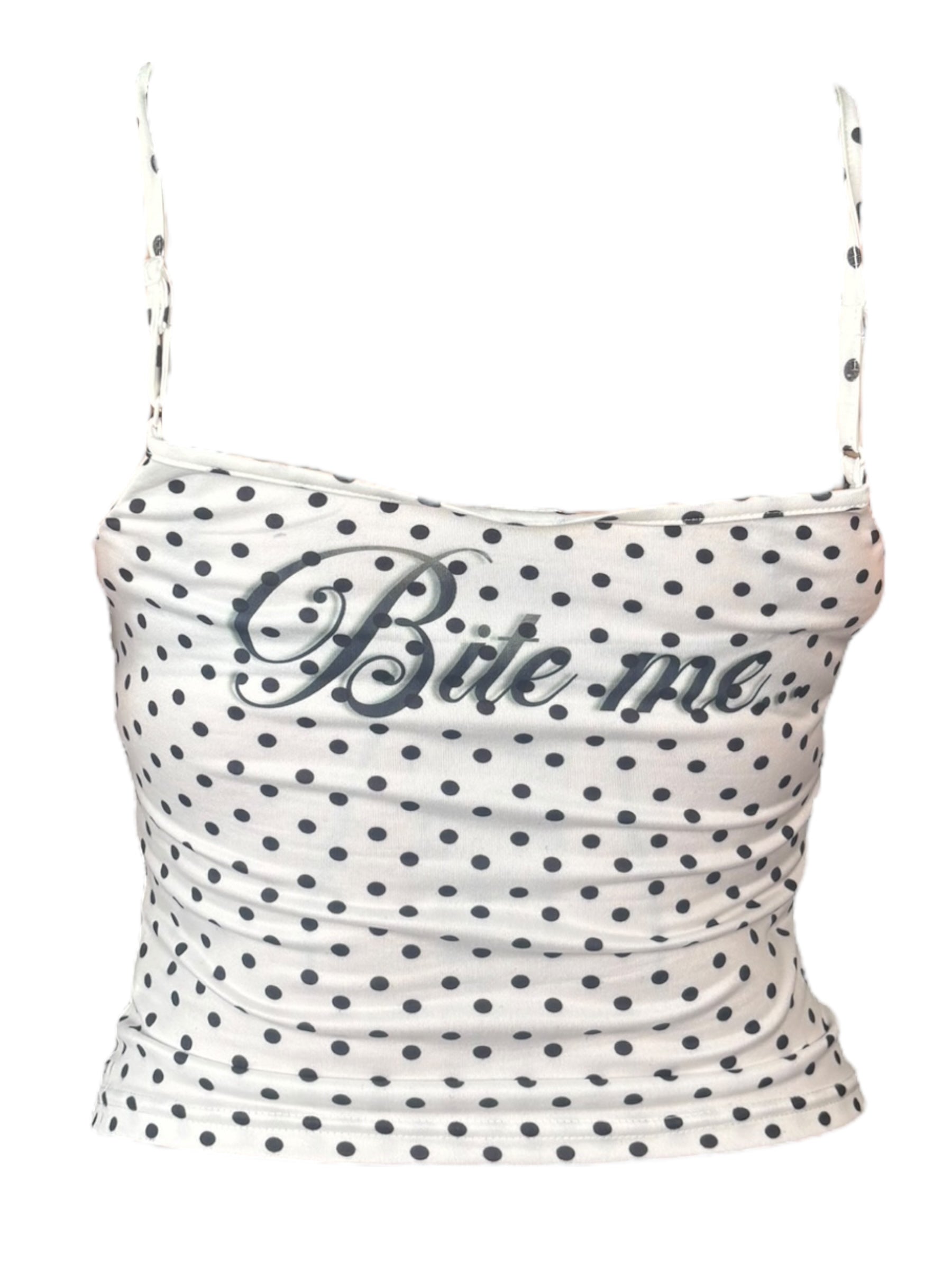 Hand-printed polka dot tank with adjustable straps and Bite Me/teeth design.
