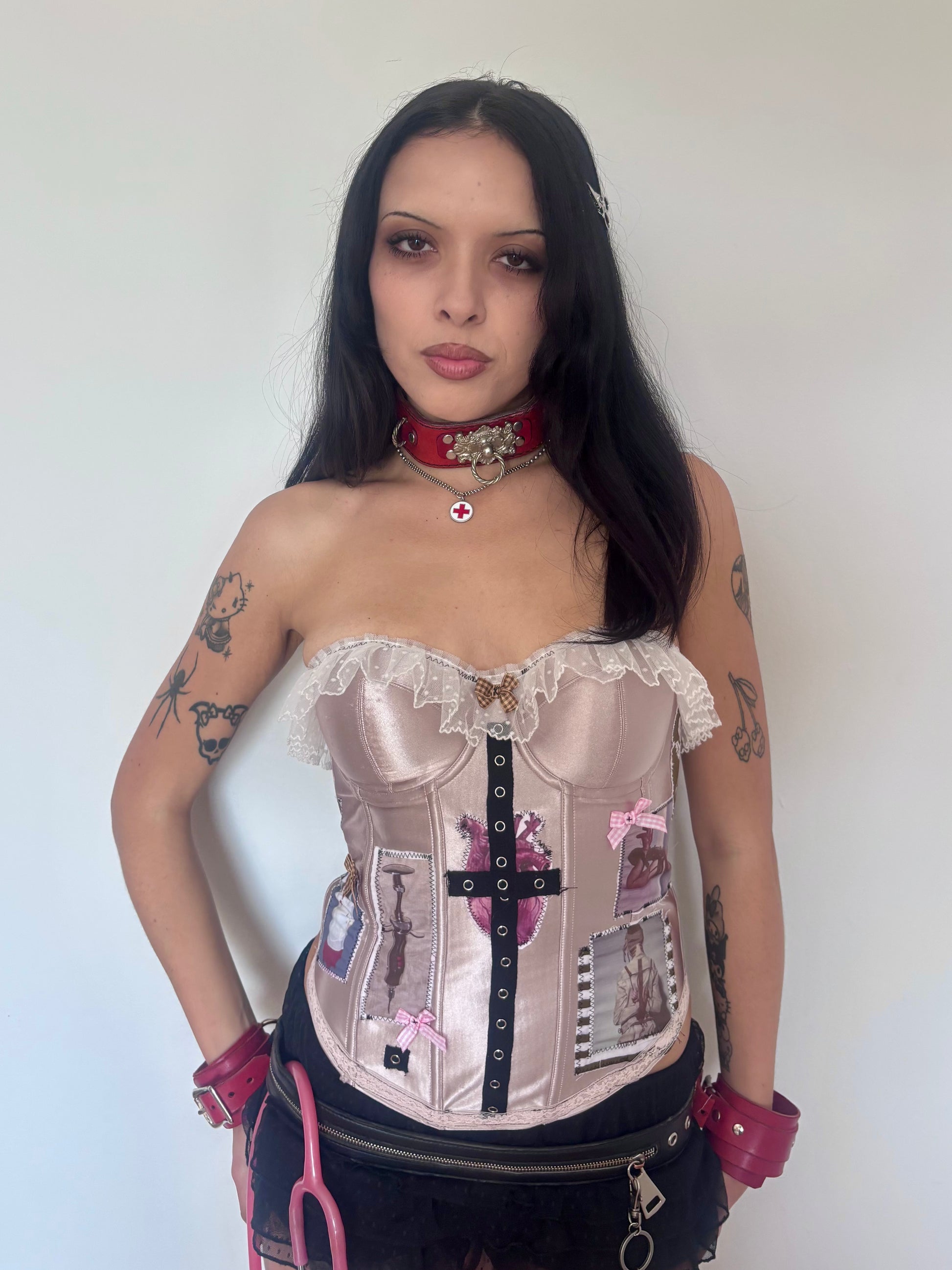 Up-cycled vintage corset with hand-made patches, decorative stitching, lace and bow detailing, and grommet cross. Adjustable hook and eye closure in back.