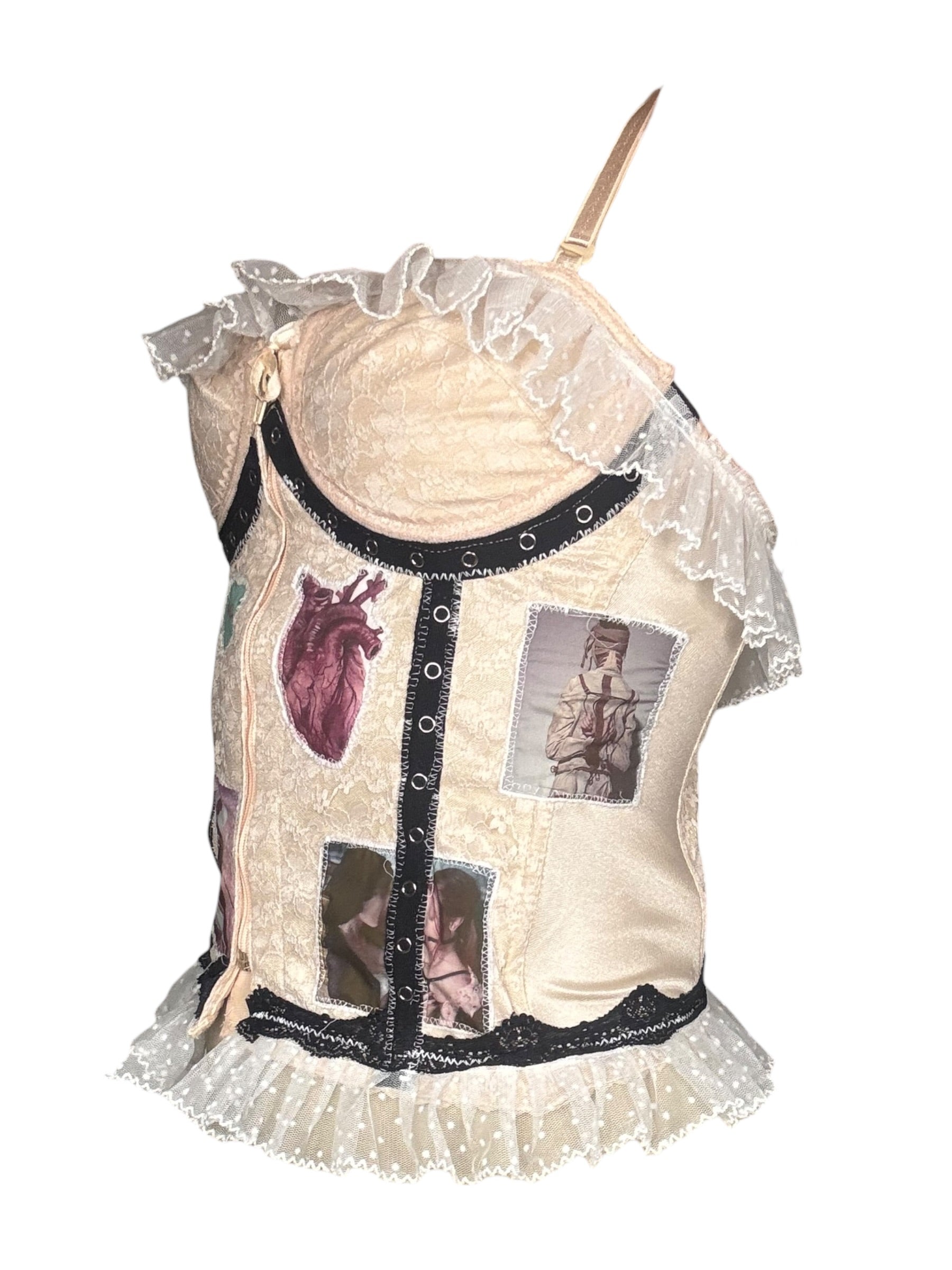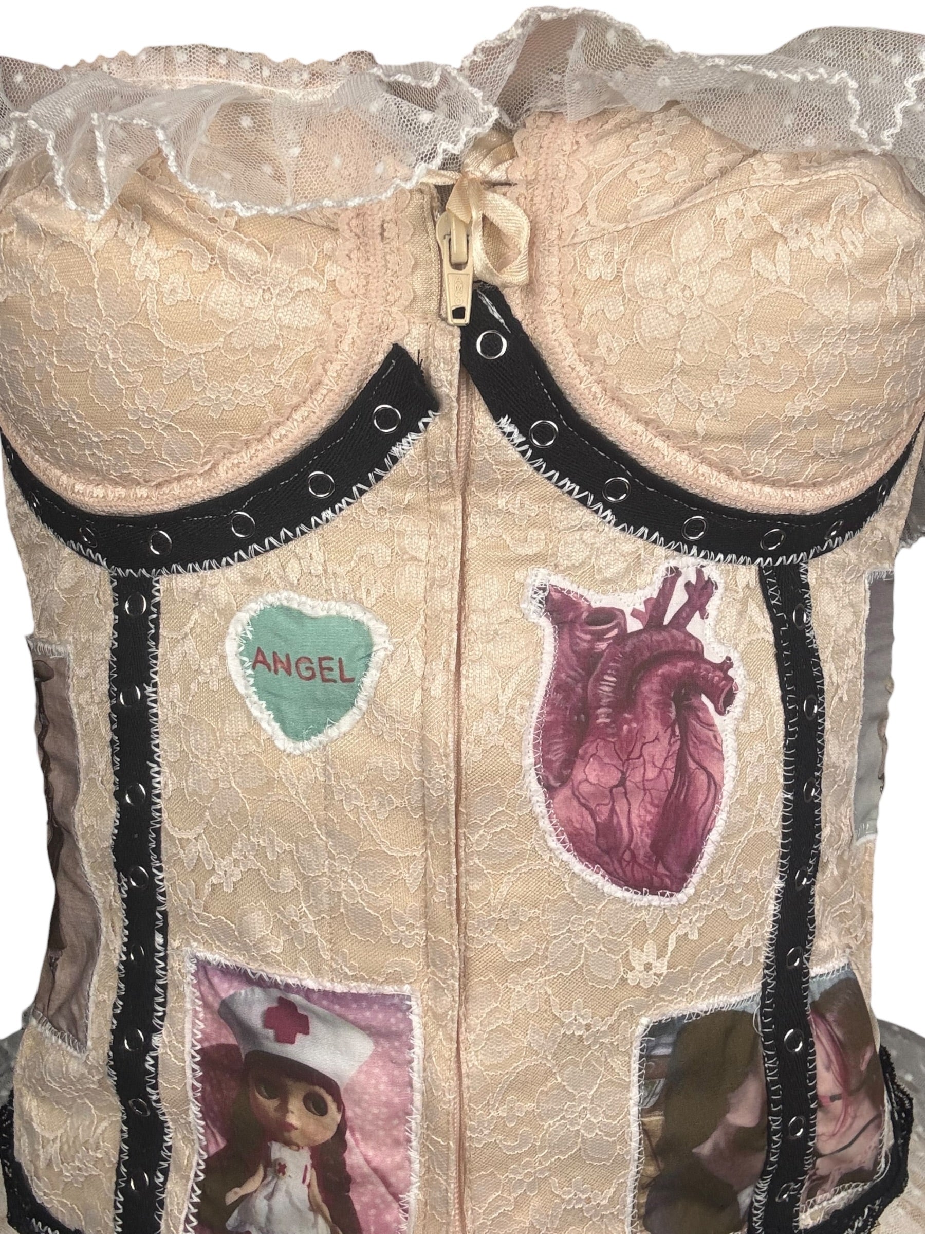 Hand-printed and customized vintage lace corset with zipper and hook and eye closure on front.