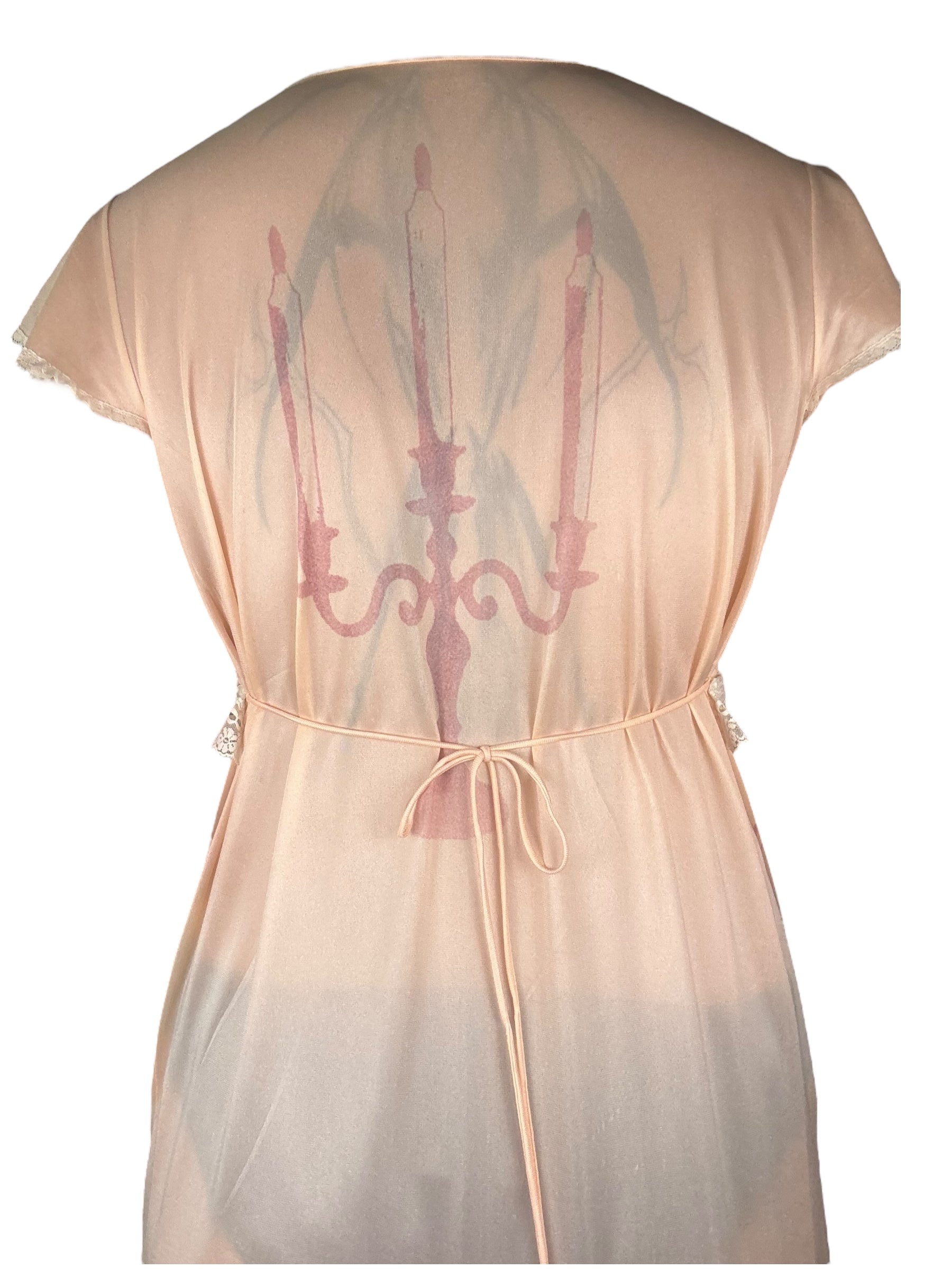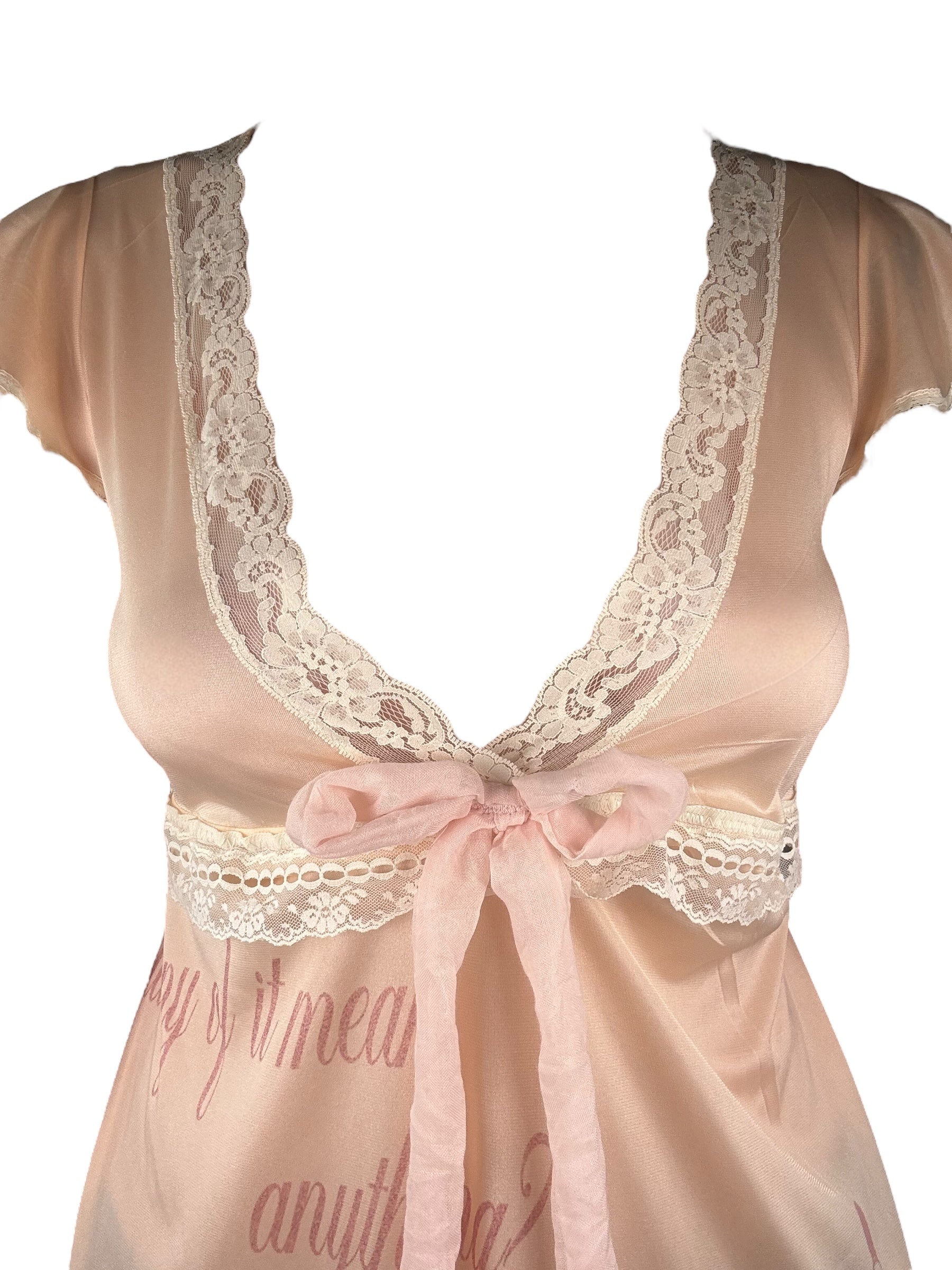 Hand-printed vintage slip dress with vintage lace and bow detailing.