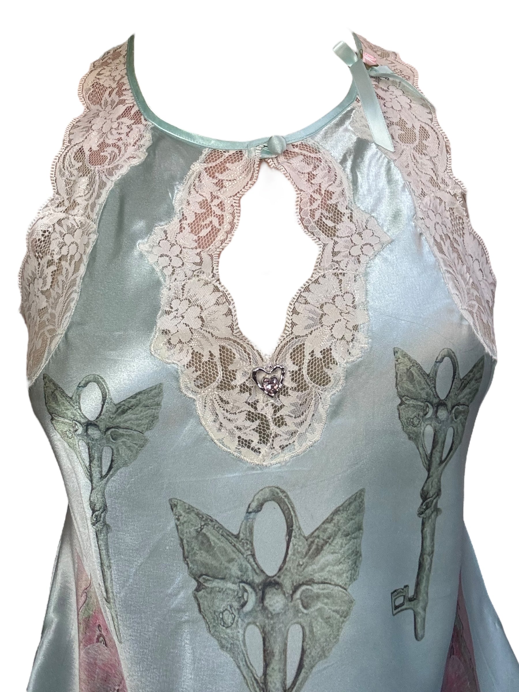 Hand-printed upcycled slip top, embellished with bow, rosette, and lace. Meant to be worn slightly loose.