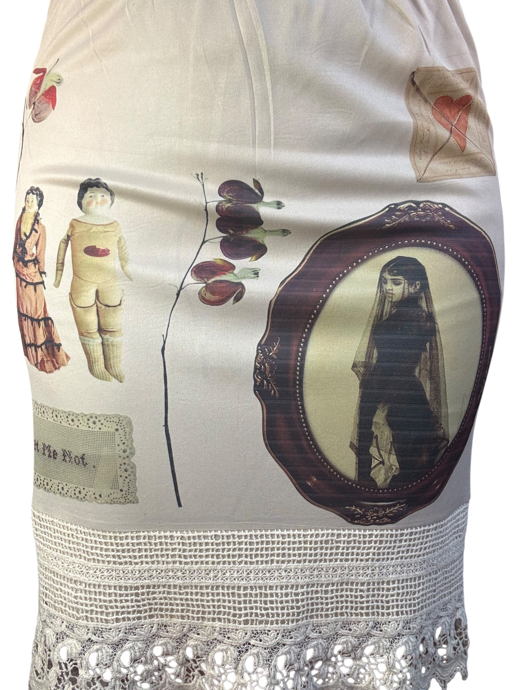 Hand-printed vintage skirt with crochet lace detail