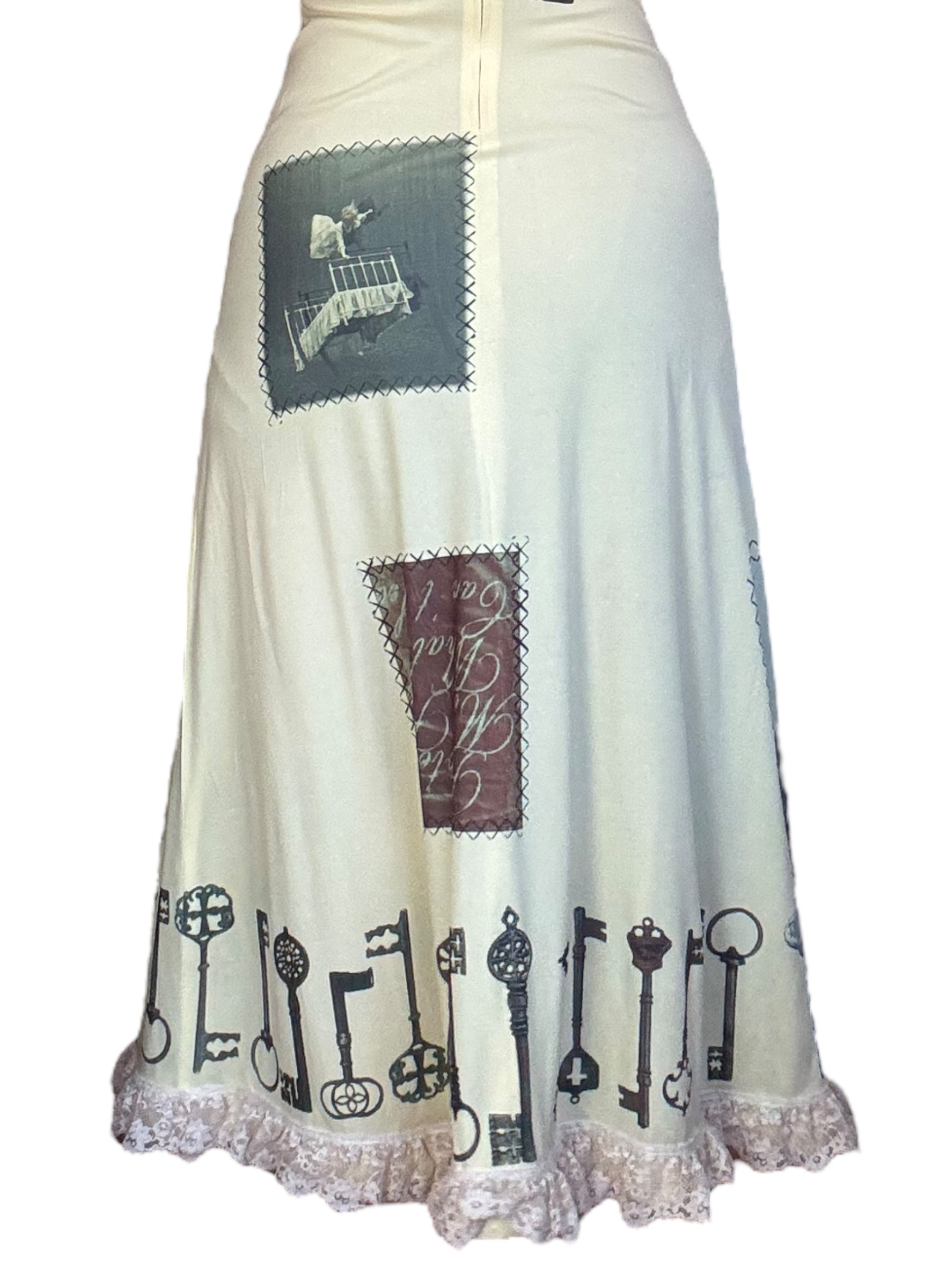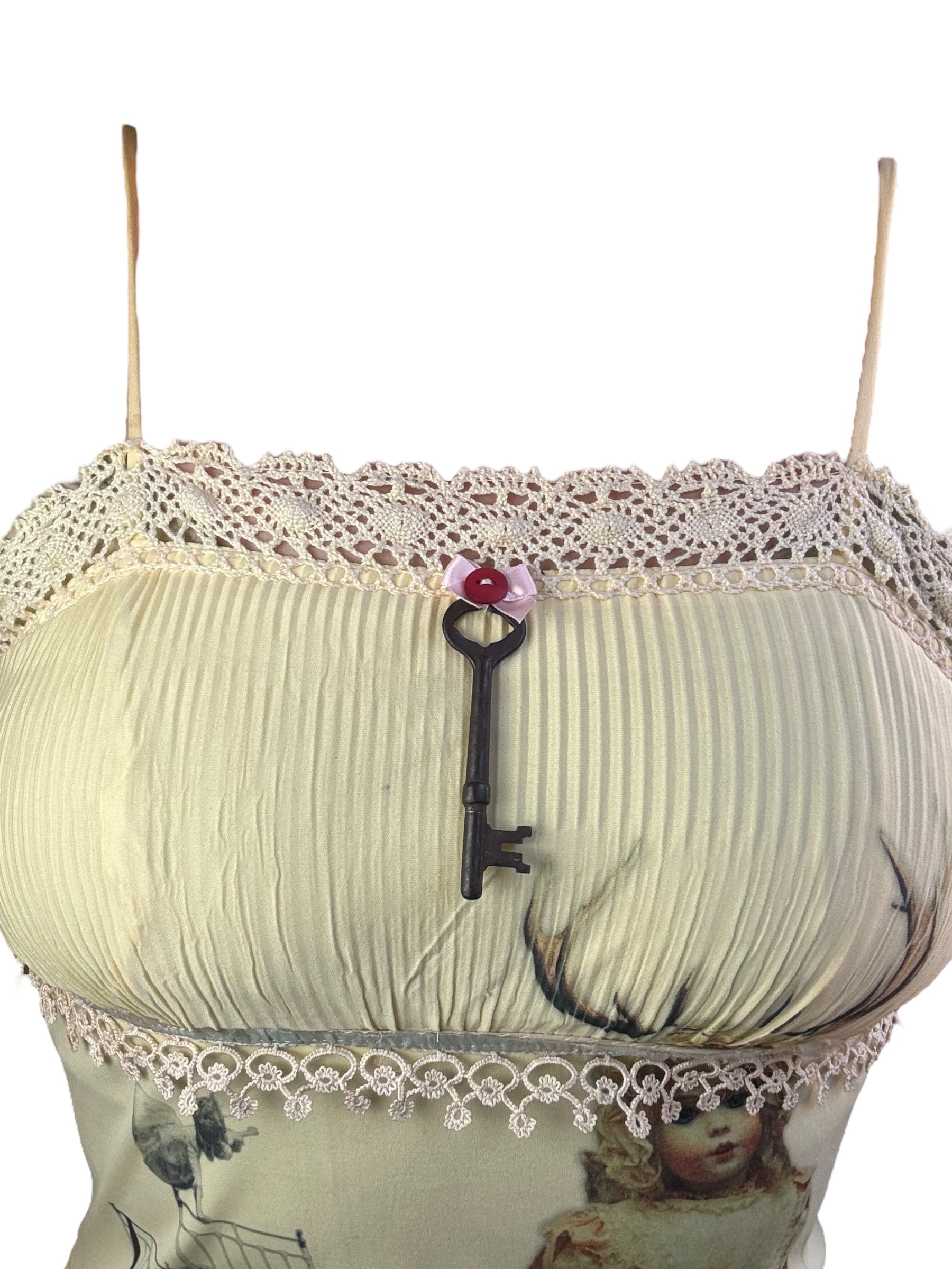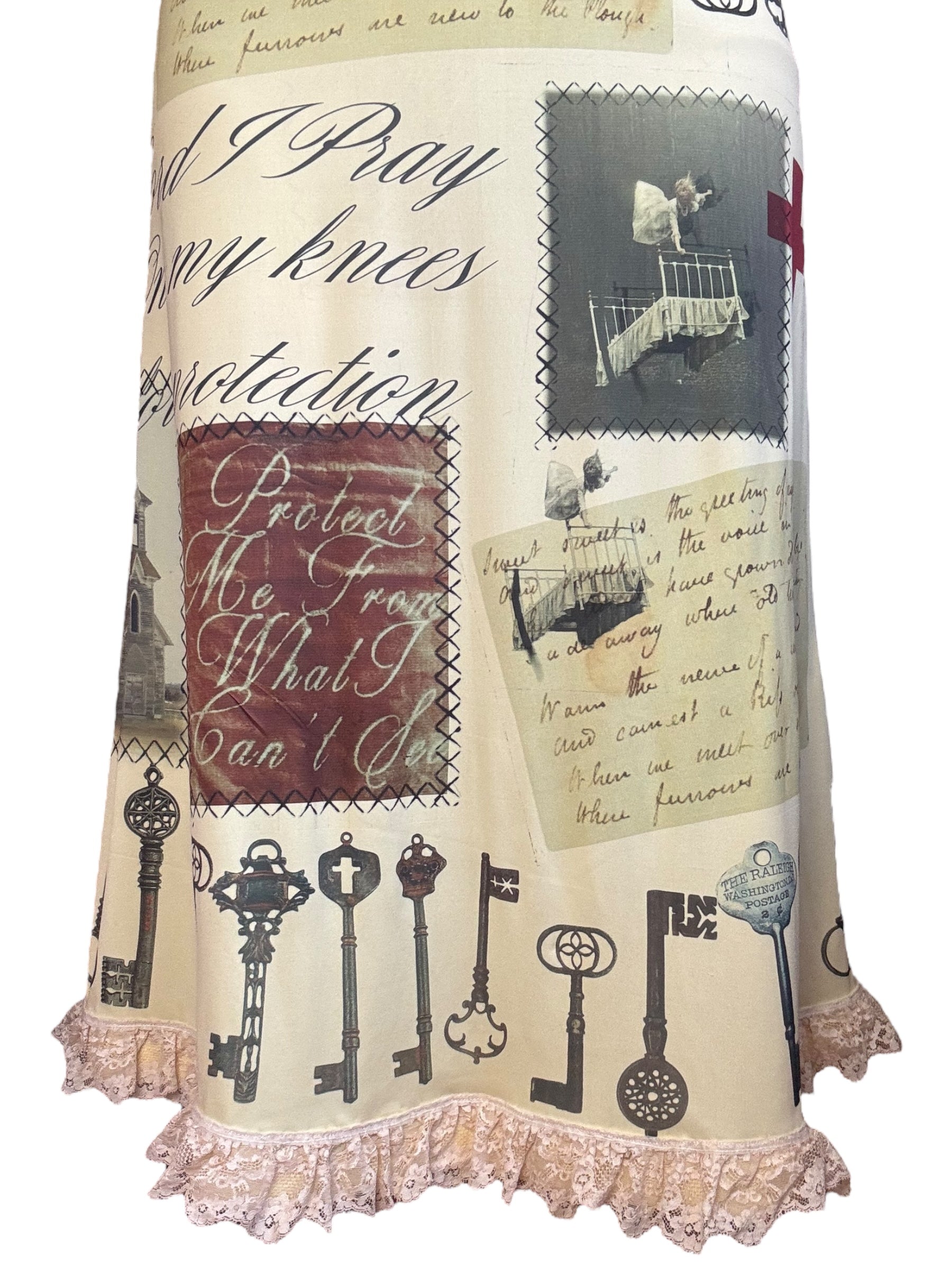 Hand-printed vintage slip dress, embellished with vintage and hand-crocheted lace + charm.