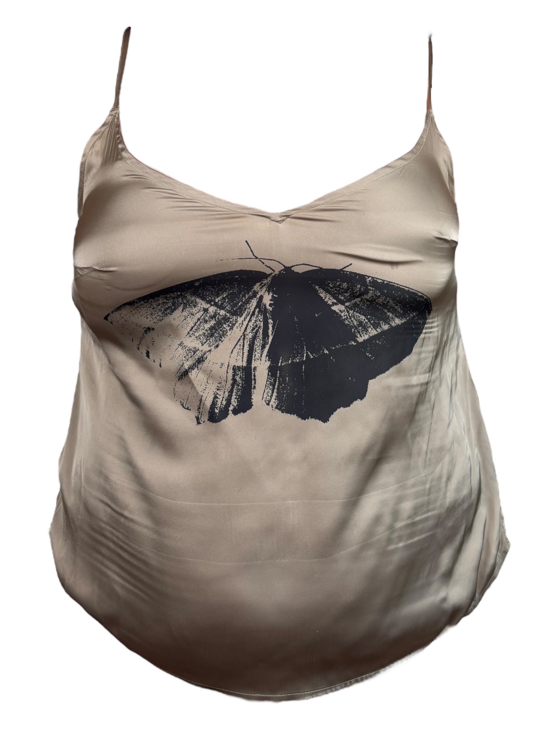 Hand-printed upcycled tank/blouse/tee. Small black misprint as pictured.
