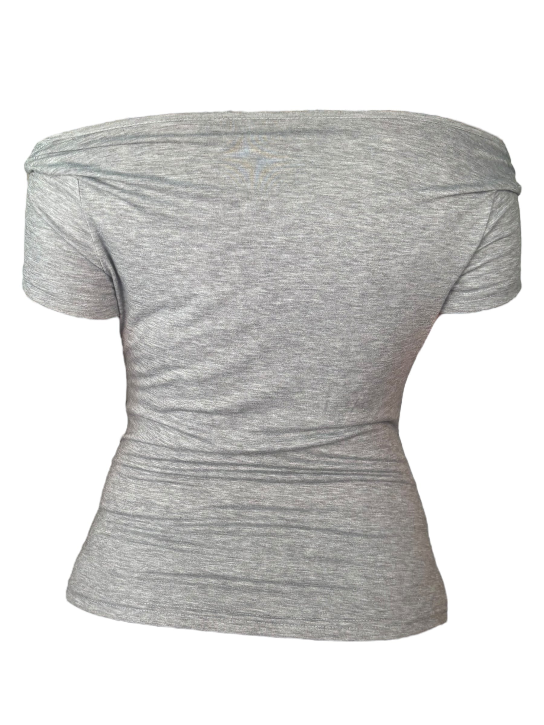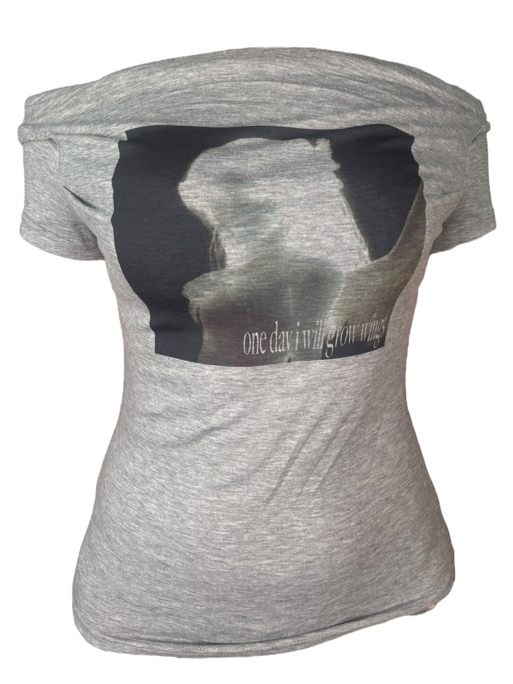 Hand-printed upcycled off-shoulder grey top. This item is made to order and will take 1-3 weeks to make and ship out!