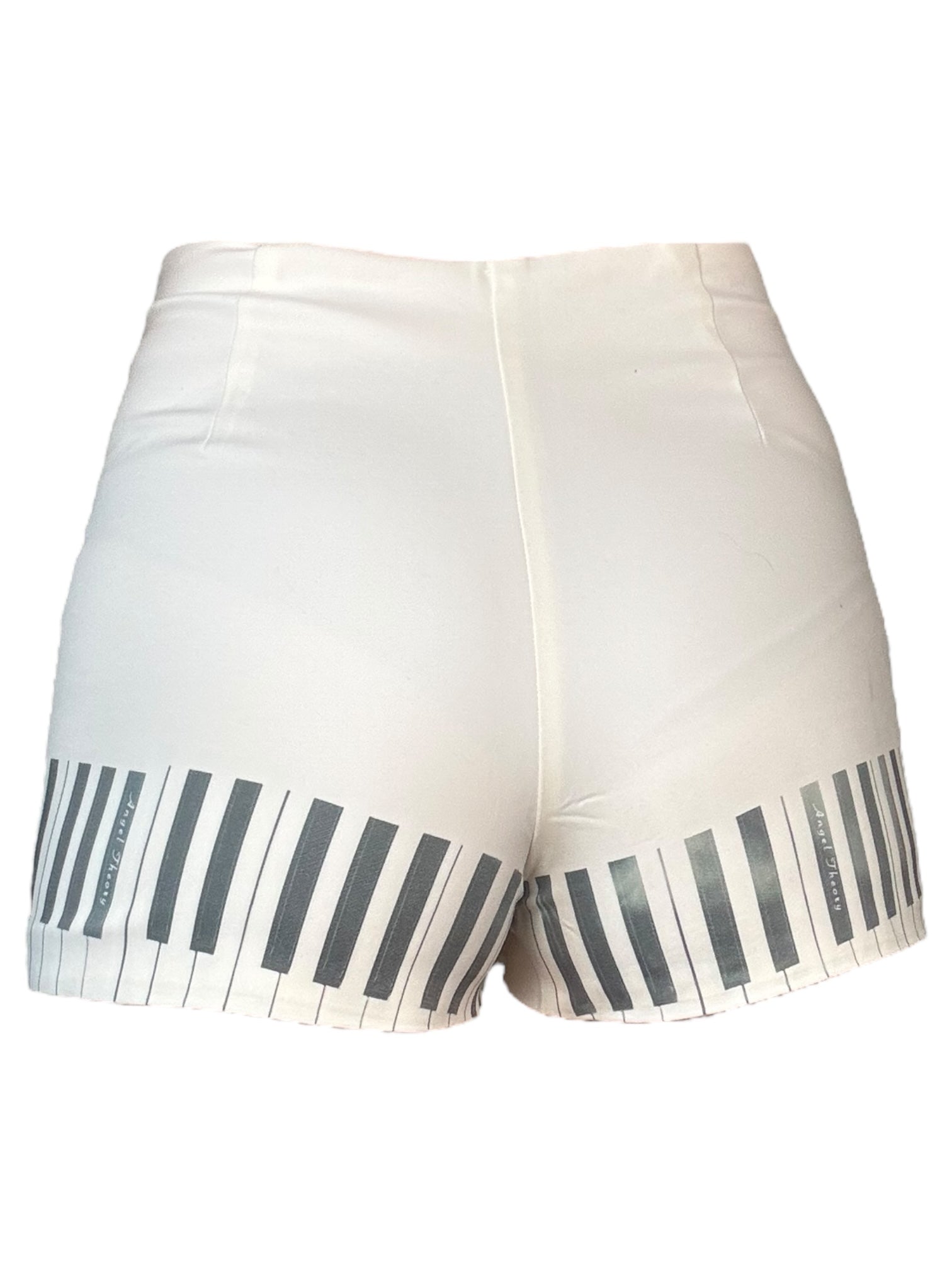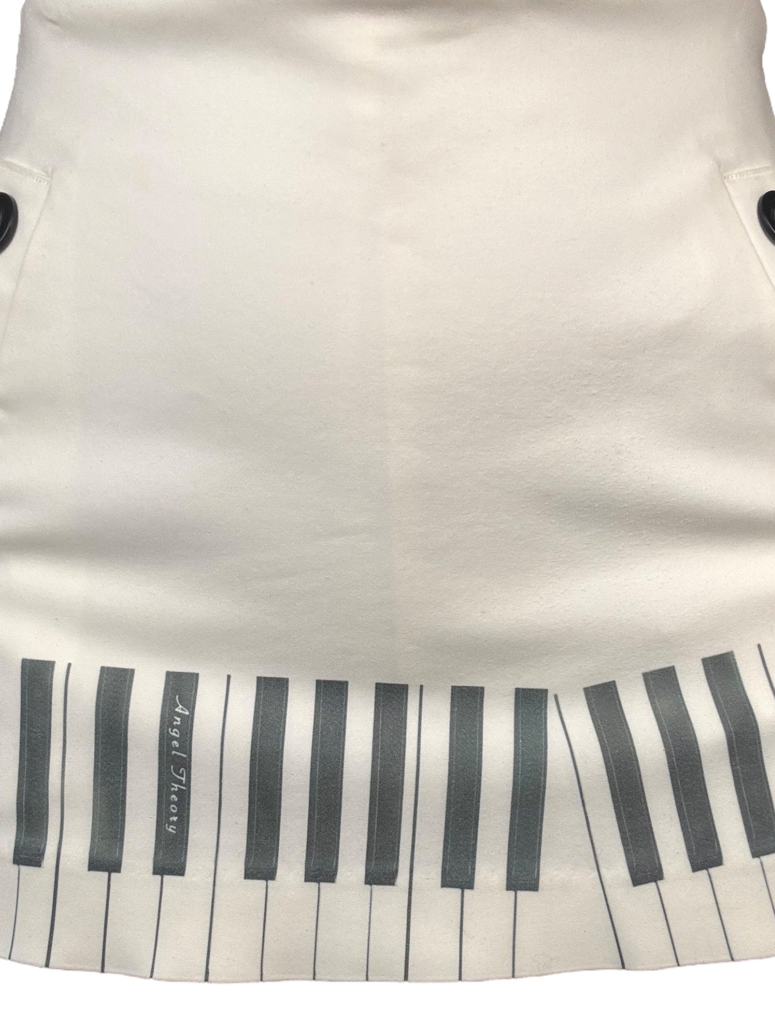 Hand-printed upcycled skort with sailor buttons and piano print.
